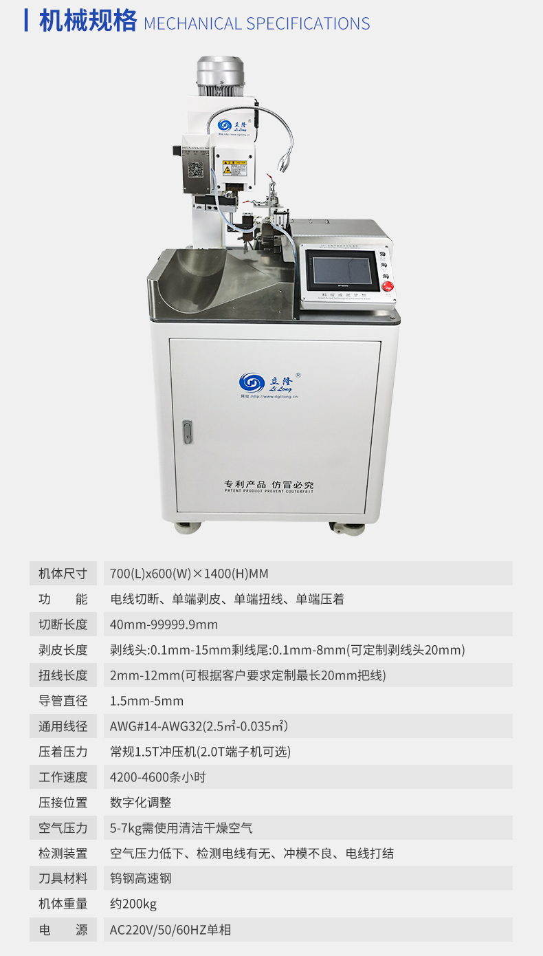 LL-551/551+T(帶扭線)全數(shù)字智能單端壓著機 產(chǎn)品說明: 1.精巧,緊湊的設(shè)計,極佳人性化設(shè)計,占地面積小。 2.數(shù)字智能觸摸屏和按鍵中文操作菜單易學(xué)易用。 3.可儲存100套加工程序,更換工序和材料...